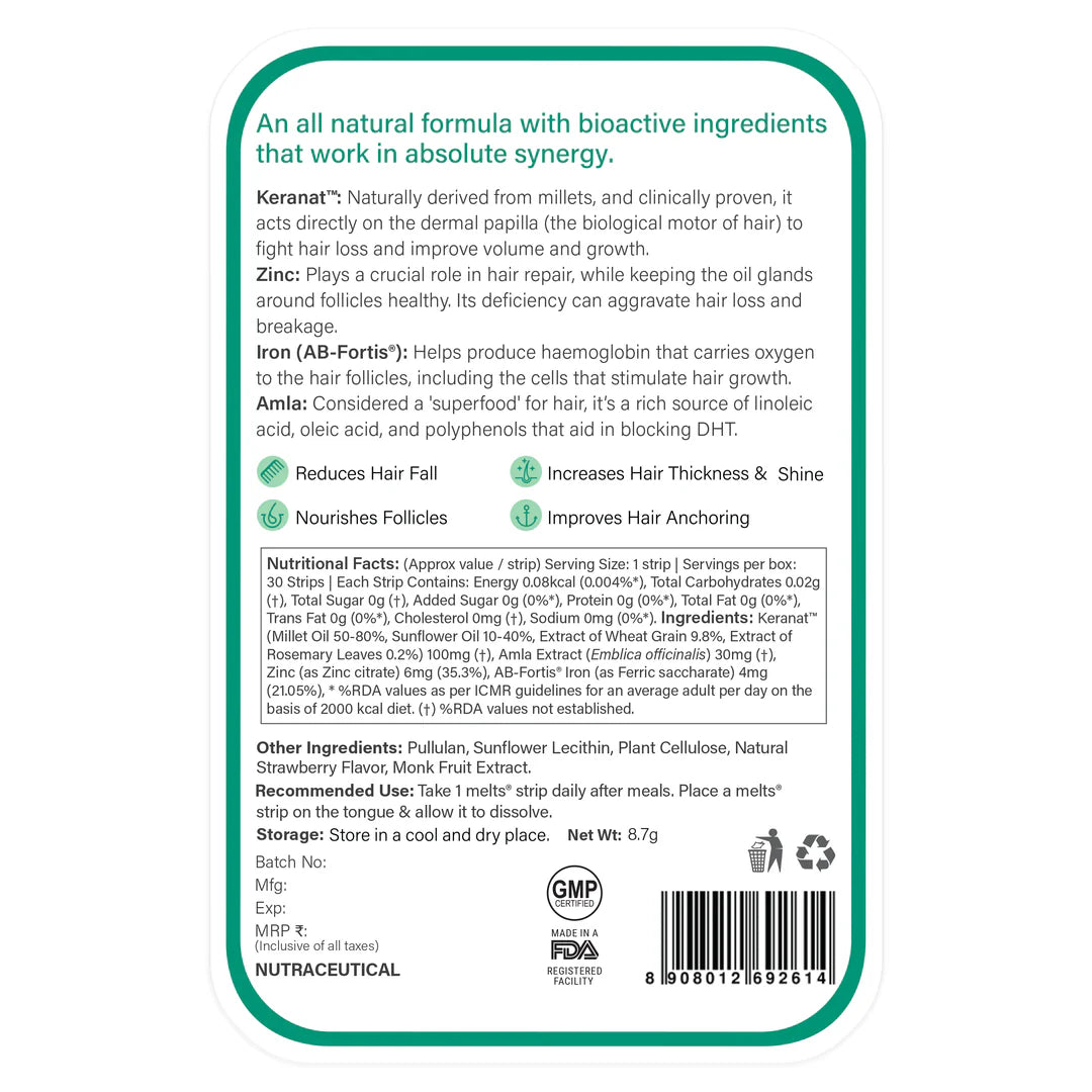 Hair fall oral strips with a fast-acting, 100% plant-based formulation with Keranat™ - a patented complex developed from a variety of Panicum miliaceum L. cultivated in France. This potent 4 in 1 formulation also brings together Zinc, Iron, and Indian Gooseberry to provide structuring & protection to your mane.