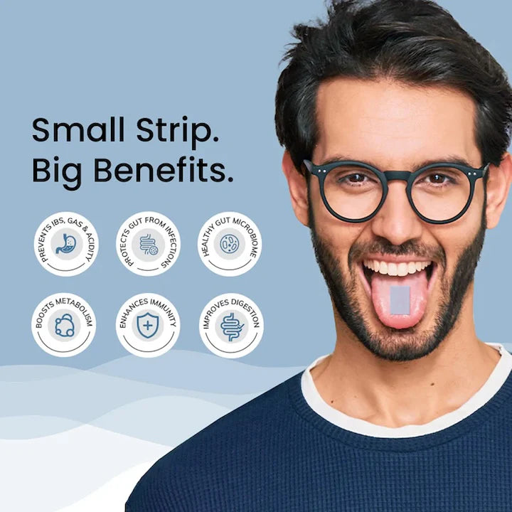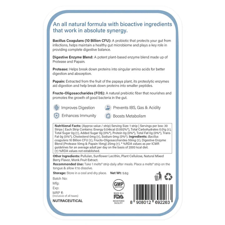 10 Billion CFU of probiotics, Digestive Enzymes and FOS in a strip to help break down protein and carbs easily, nourish the gut, prevent gut disorders and support healthy digestive function.