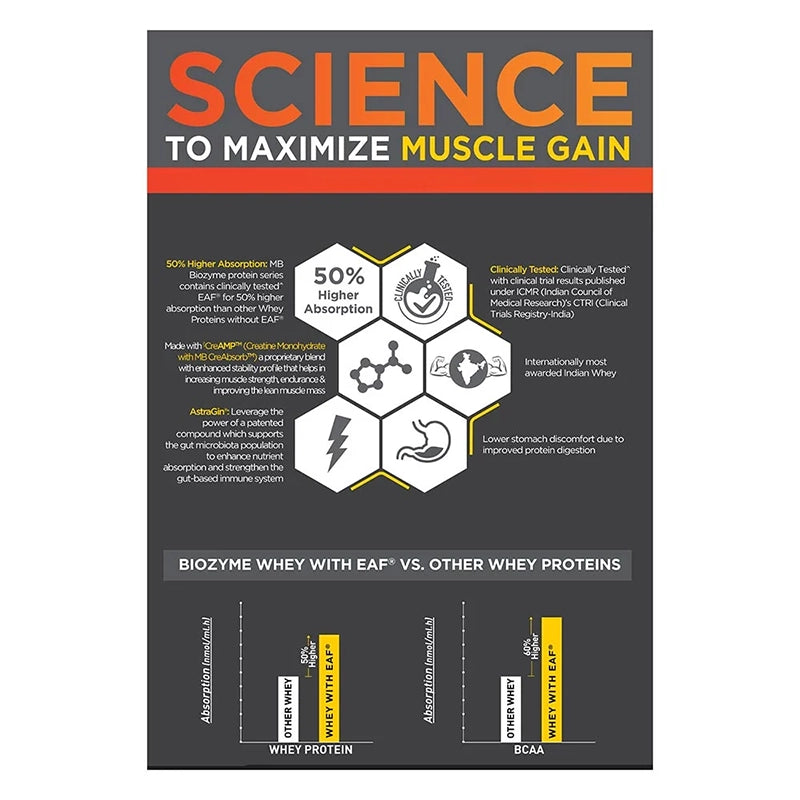 With a cutting-edge formulation, Biozyme Whey PR goes beyond just protein, delivering a powerful combination of science-backed ingredients - Enhanced Absorption Formula (EAF) technology ensuring superior protein absorption, CreAMP fueling explosive strength gains, and AstraGin optimizing nutrient uptake. All-in-all, it is your secret weapon for achieving that sculpted physique you've always desired.