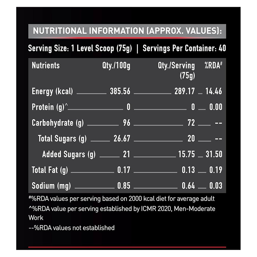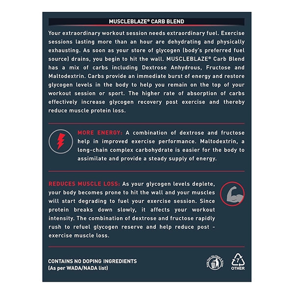 MuscleBlaze Carb Blend, 6.6 lb unflavoured is made from some of the best ingredients, such as Maltodextrin, Dextrose, Fructose, Unflavoured Fruit Powder and Acidifying Agent (INS 330).