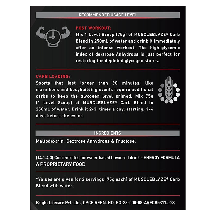 Carb Loading: Confused about what is carb-loading? Well, if you are going to engage in any event related to strenuous exercises or heavy workouts that would last for more than 90 minutes, you can consume around 2-3 servings of MuscleBlaze Carb Blend, 6.6lb unflavoured every day about 4 days prior to this event for sufficient carb loading.