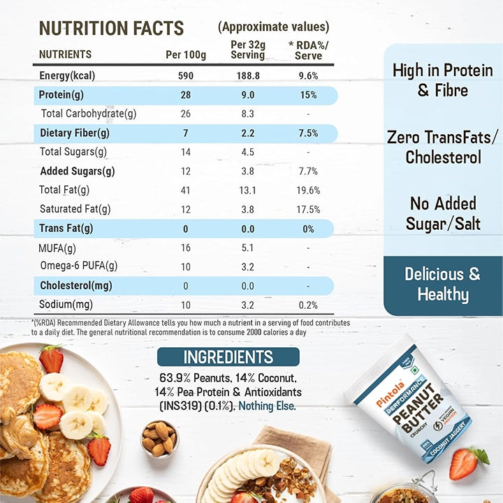 Pintola Coconut Jaggery Performance Series Peanut Butter (Crunchy) - 1kg | Vegan Protein | 28% Protein | High Protein & Fiber